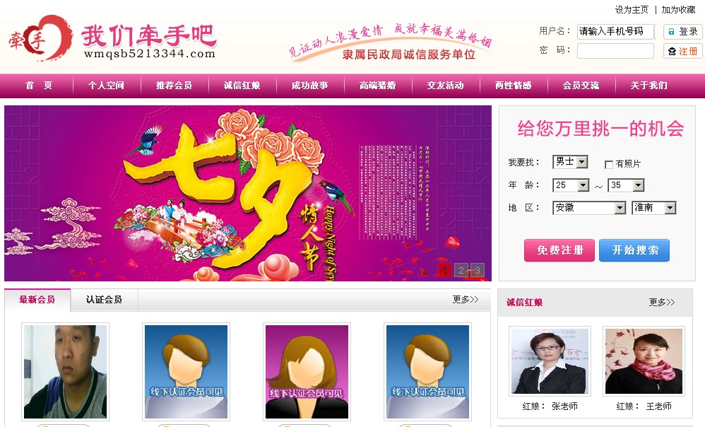 訊網(wǎng)公司淮南牽手婚慶成功創(chuàng)辦淮南牽手交友網(wǎng)-我們牽手吧-淮南專業(yè)婚戀交友網(wǎng),現(xiàn)已全面上線!