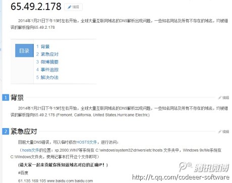 最新消息在2014年1月21日下午3點30分,中國大陸境內(nèi)網(wǎng)站域名DNS服務(wù)器被攻擊,域名解析被強制解析跳轉(zhuǎn)到IP:65.49.2.17,所在的美國服務(wù)器,給中國網(wǎng)站帶來巨大影響。