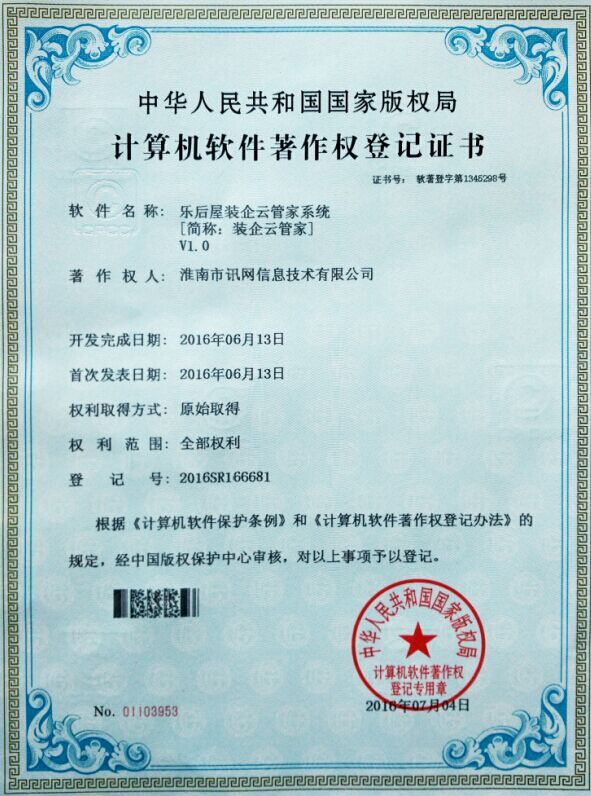 今天,經中華人民共和國國家版權局考證,根據《計算機軟件保護條例》和《計算機軟件著作權登記辦法》的規定,淮南訊網信息技術有限公司被認定為軟件——“樂后屋裝企云管家(簡稱裝企云管家)”的法定著作權人,并于2016年7月4日被正式授予《中華人民共和國國家版權局計算機軟件著作權登記證書》,登記號:2016SR166681。即日起,其版權將得到“中國版權保護中心”的有效保護。
